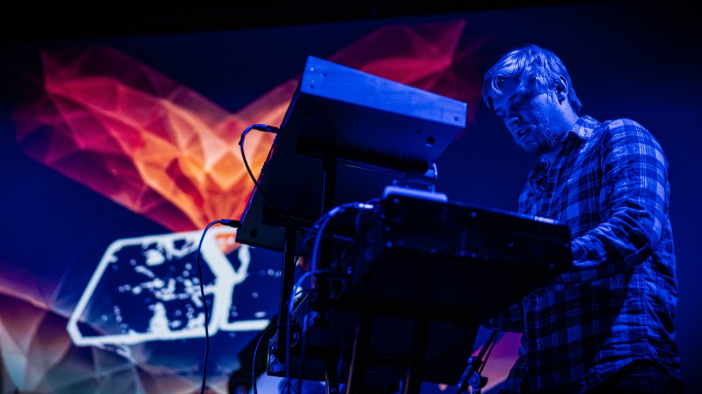 After greeting and thanking the audience, the next track Frankfurt Violence comes slamming in with brutish determination. Chaotic breakbeats grip the crowd in a whirlpool of punchy snares, kicks and hats before a guitar line gives us something to stand on. Amidst a backdrop of a long-exposure shot of a city road, the track leans back into a second alternative picking guitar line that hums over an increasingly chaotic drum track eventually overrun by an industrial synth bass-line sequenced in hell – think Nine Inch Nails on the drum-and-bass circuit. The more house-inspired track Berlin Is Calling, Pt. 1 comes thumping in with a four-on-the-floor. Trap-like hats flitter alongside broken guitar screeches and heavily delayed vocals that moan with grit, inspiring the audience to begin clapping in time with the infectious beat.