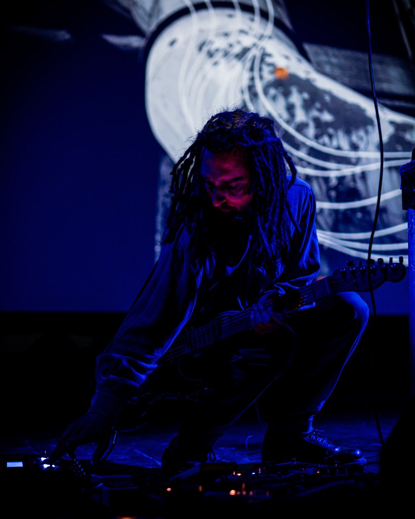 Hailing from Turin, Italy but now based in Bristol, the two-piece Vetna hit the stage around 10. Starting slow with the track Purity, Lorenzo tinkers on his impressive array of gear, summoning a wall of atmospheric drones and pads that blanket a swooning trumpet line. Glitchy percussive motifs are effectuated alongside Antonio’s rambling fingerstyle guitar before the sound of rain comes into earshot, puttering out the track.